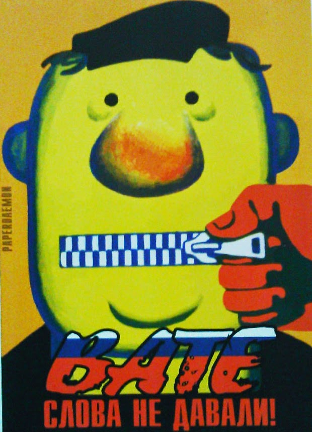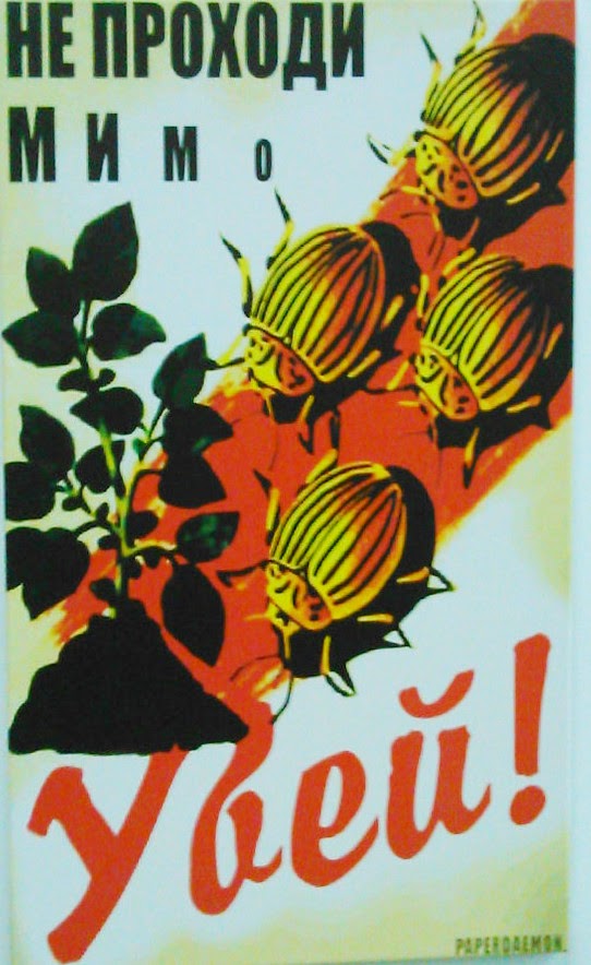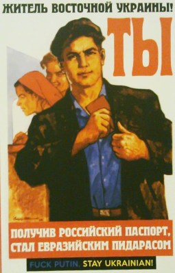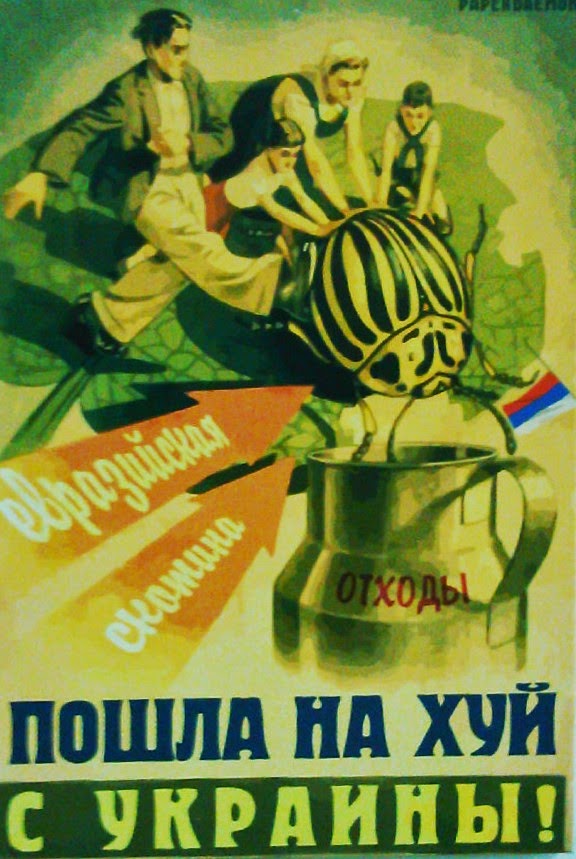 I have to explain the last one: what you see is a “Colorado beetle” (Leptinotarsa decemlineata) which has colors similar to the ones seen on the Russian Saint George Ribbon. In other words, this poster says that if you pass by a Russian you should kill him. Notice the other themes: the Maidan was God’s voice, the Russians are “Eurasians” who are beasts who should have no right, not even the right to speak or live. This is exactly the same propaganda style as used by Hitler against Jews and we all know how this ended (yet again another proof that to refer to the junta as “Nazi” is perfectly justified).