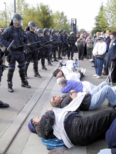 The emphasis on the use of new communication technologies to rapidly deploy small groups, suggests what we are seeing is civilian application of Secretary Donald Rumsfeld’s “Revolution in Military Affairs” doctrine, which depends on highly mobile small group deployments “enabled” by “real time” intelligence and communications. Squads of soldiers taking over city blocks with the aid of “intelligence helmet” video screens that give them an instantaneous overview of their environment, constitute the military side. Bands of youth converging on targeted intersections in constant dialogue on cell phones constitute the doctrine’s civilian application.