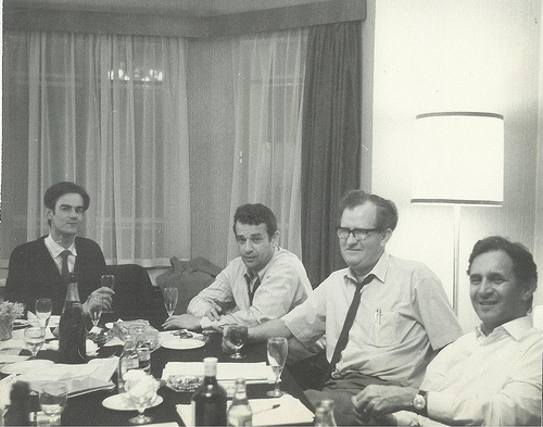 As in the case of the new communication technologies, the potential effectiveness of angry youth in postmodern coups has long been under study. As far back as 1967, Dr. Fred Emery [pictured third from left], then director of the Tavistock Institute, and an expert on the “hypnotic effects” of television, specified that the then new phenomenon of “swarming adolescents” found at rock concerts could be effectively used to bring down the nation-state by the end of the 1990s. This was particularly the case, as Dr. Emery reported in “The next thirty years: concepts, methods and anticipations,” in the group’s “Human Relations,” because the phenomena was associated with “rebellious hysteria.” The British military created the Tavistock Institute as its psychological warfare arm following World War I; it has been the forerunner of such strategic planning ever since. Dr. Emery’s concept saw immediate application in NATO’s use of “swarming adolescents” in toppling French President Charles De Gaulle in 1967.