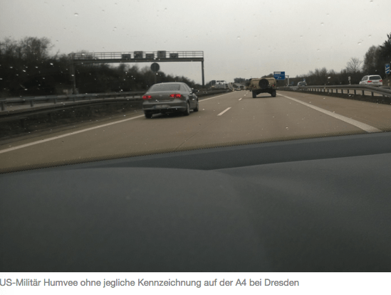 | “US military Humvee on the A4 near Dresden. No markings at all” |