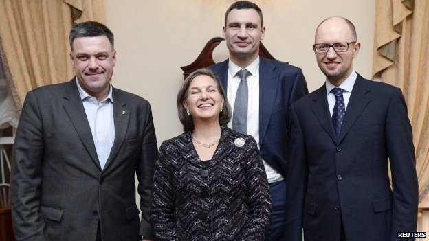 Svoboda leader Oleg Tyagnibok with patrons John McCain and Victoria Nuland