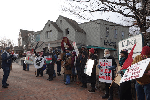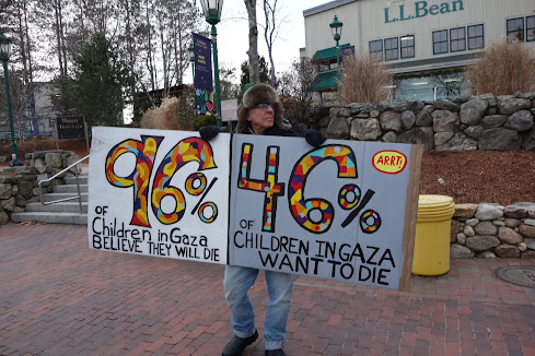 Forty of us gathered in Freeport, Maine today (a holiday shopping mecca in our state) right in front of the famous L.L. Bean store. This was our monthly protest that we’ve been doing for a couple of years in different busy traffic areas across the state.
