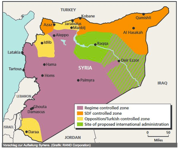 The RAND Corporation calls for a decentralization of the country in control zones. The area from the west coast to Deir Ezzor with the exclusion of Rakka is to be controlled by the government in Damascus and the Russians. The area liberated by Turkey under Operation Euphrates Shield and the province of Idlib would be under Turkish control. The southern area of Daraa, on the border with Israel, would also be controlled by an “opposition” not described in detail by the RAND Corporation. A large part of Northern Syria would be controlled by the Syrian Democratic Forces (SDF), consisting of Kurdish militia and led by the US.